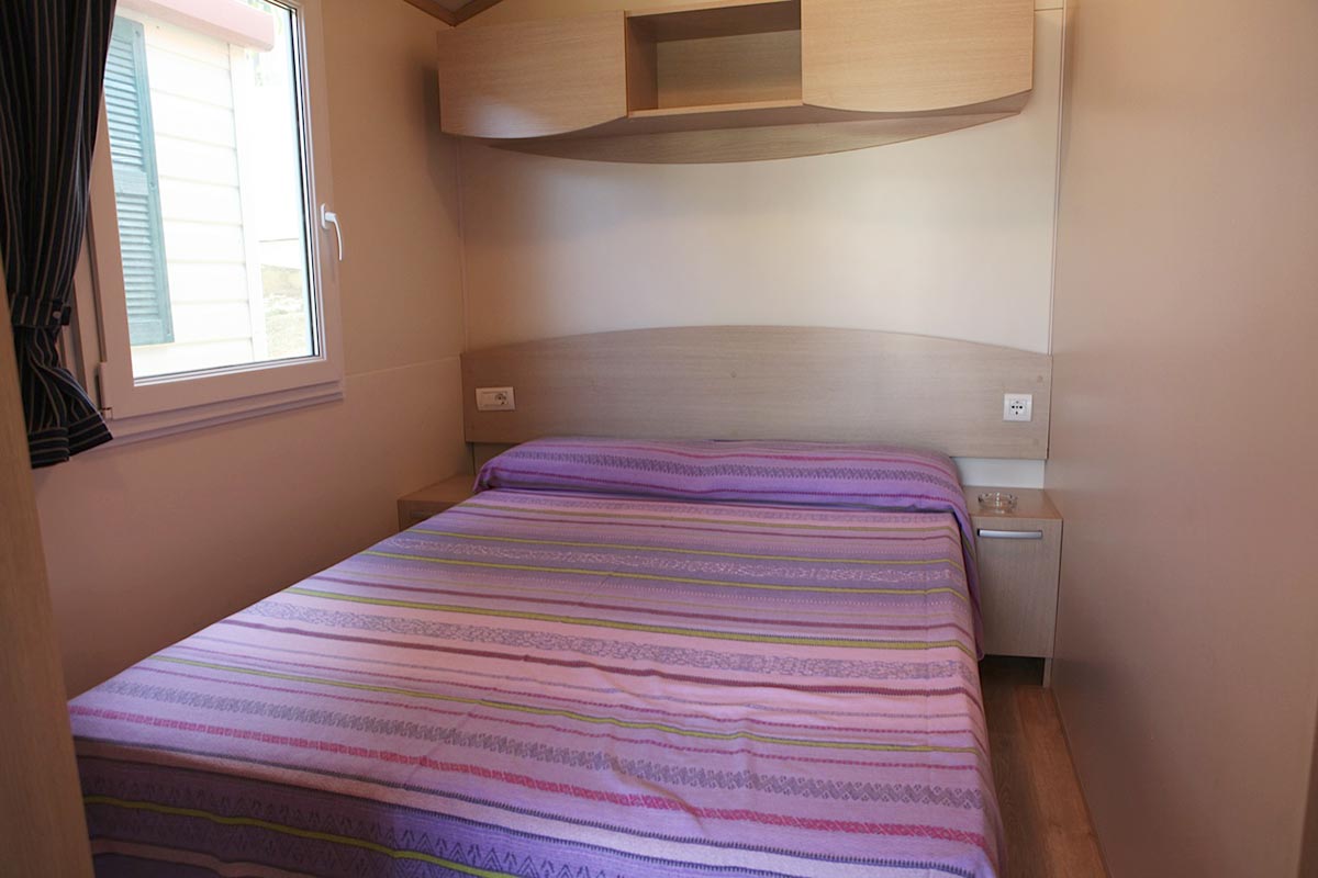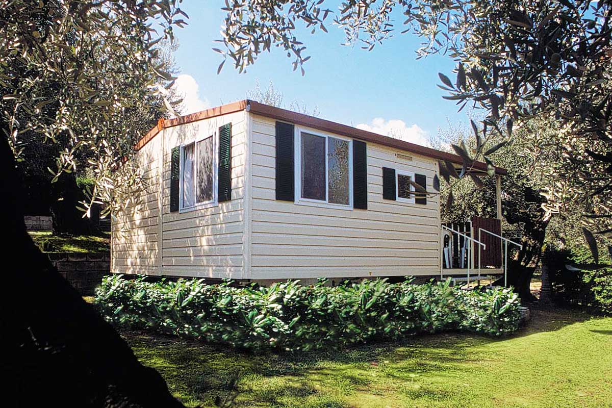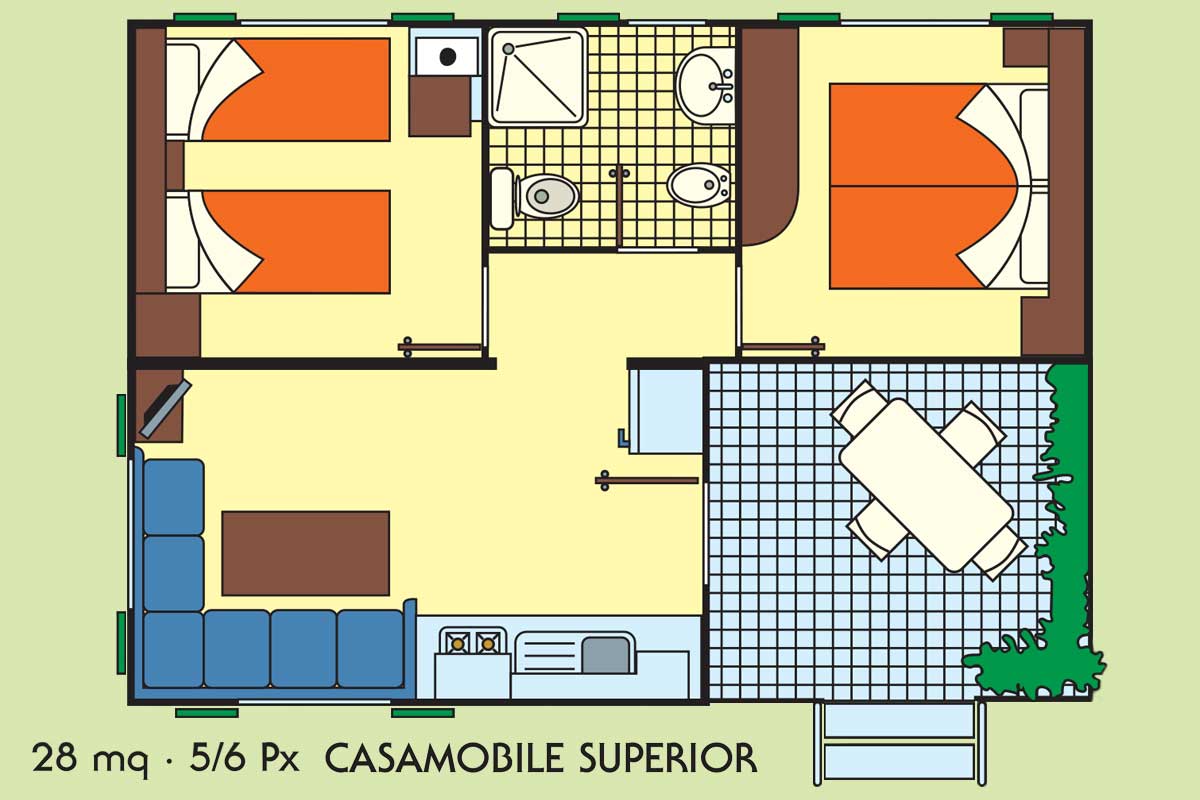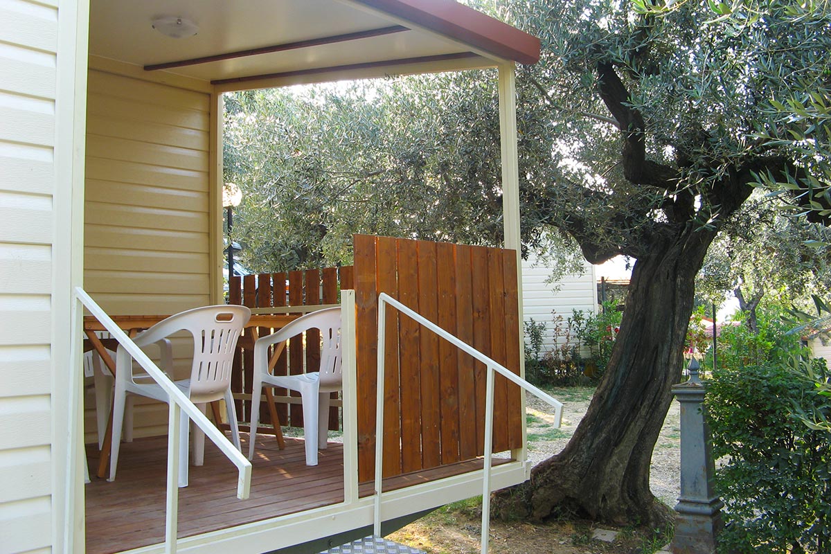 Prefabricated (28 sq.m., with fitted covered veranda), double bedroom single bedroom with two low beds, 5th bed in the living room, living room with small fitted kitchenette, indoor bathroom with shower, SAT-TV and hairdryer.
