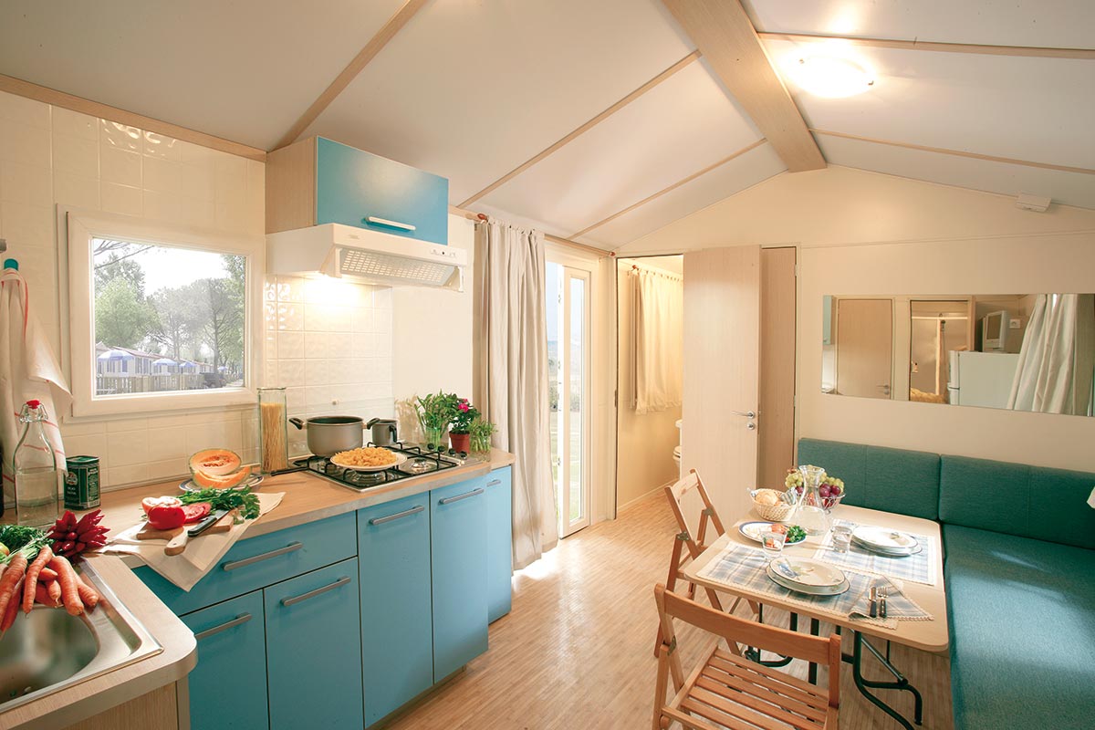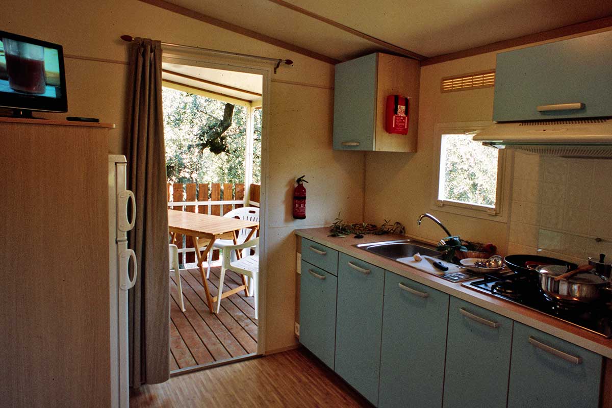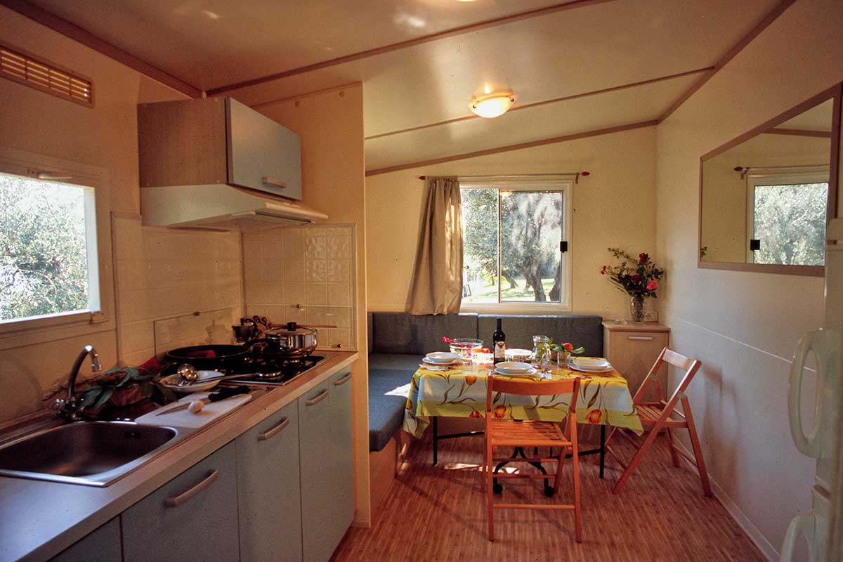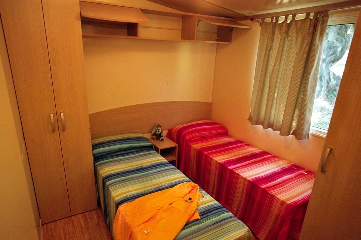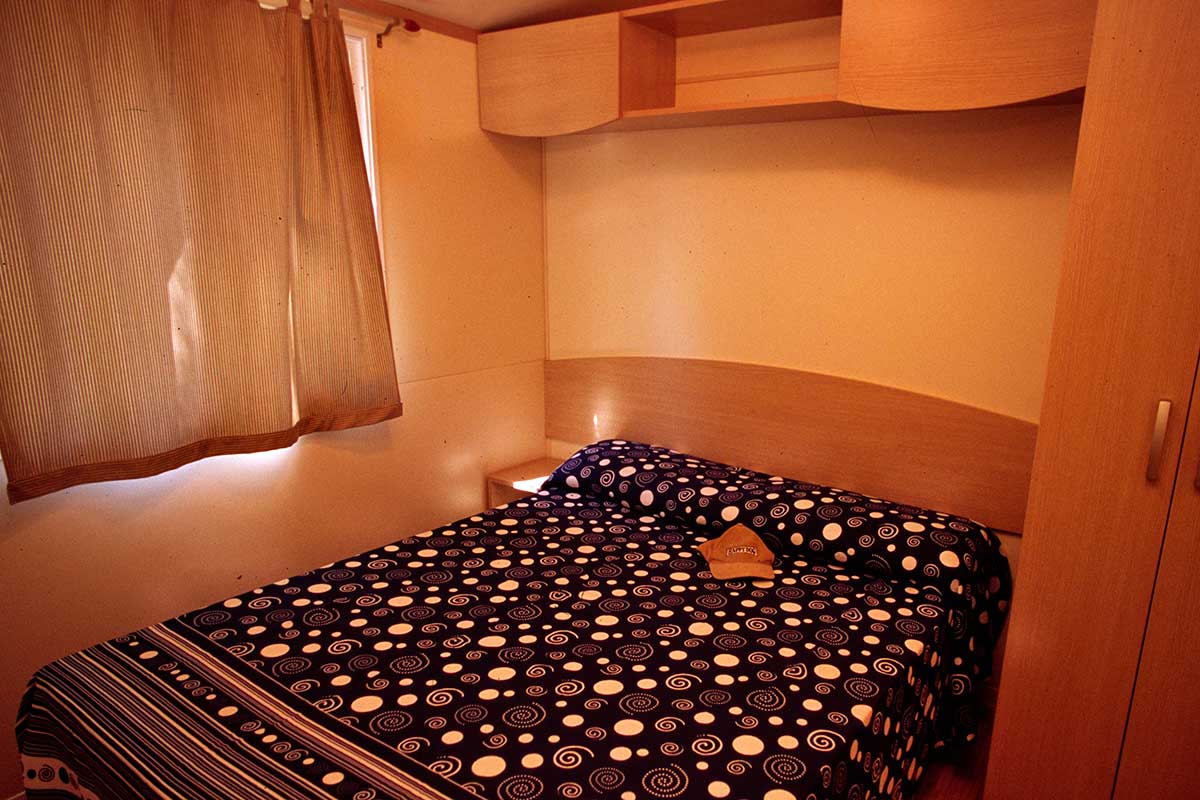 Prefabricated (28 sq.m., with fitted covered veranda), double bedroom single bedroom with two low beds, 5th bed in the living room, living room with small fitted kitchenette, indoor bathroom with shower, SAT-TV and hairdryer.