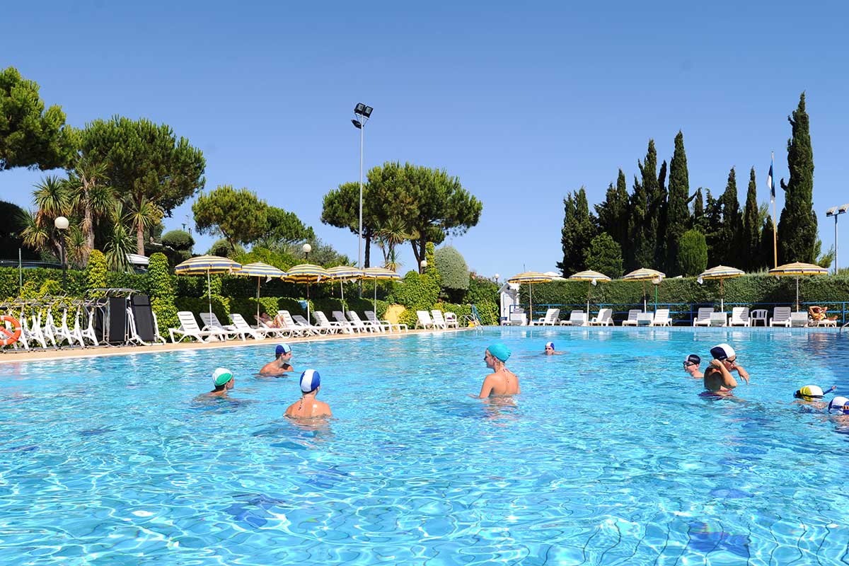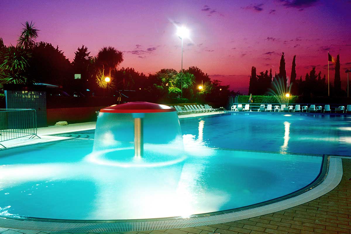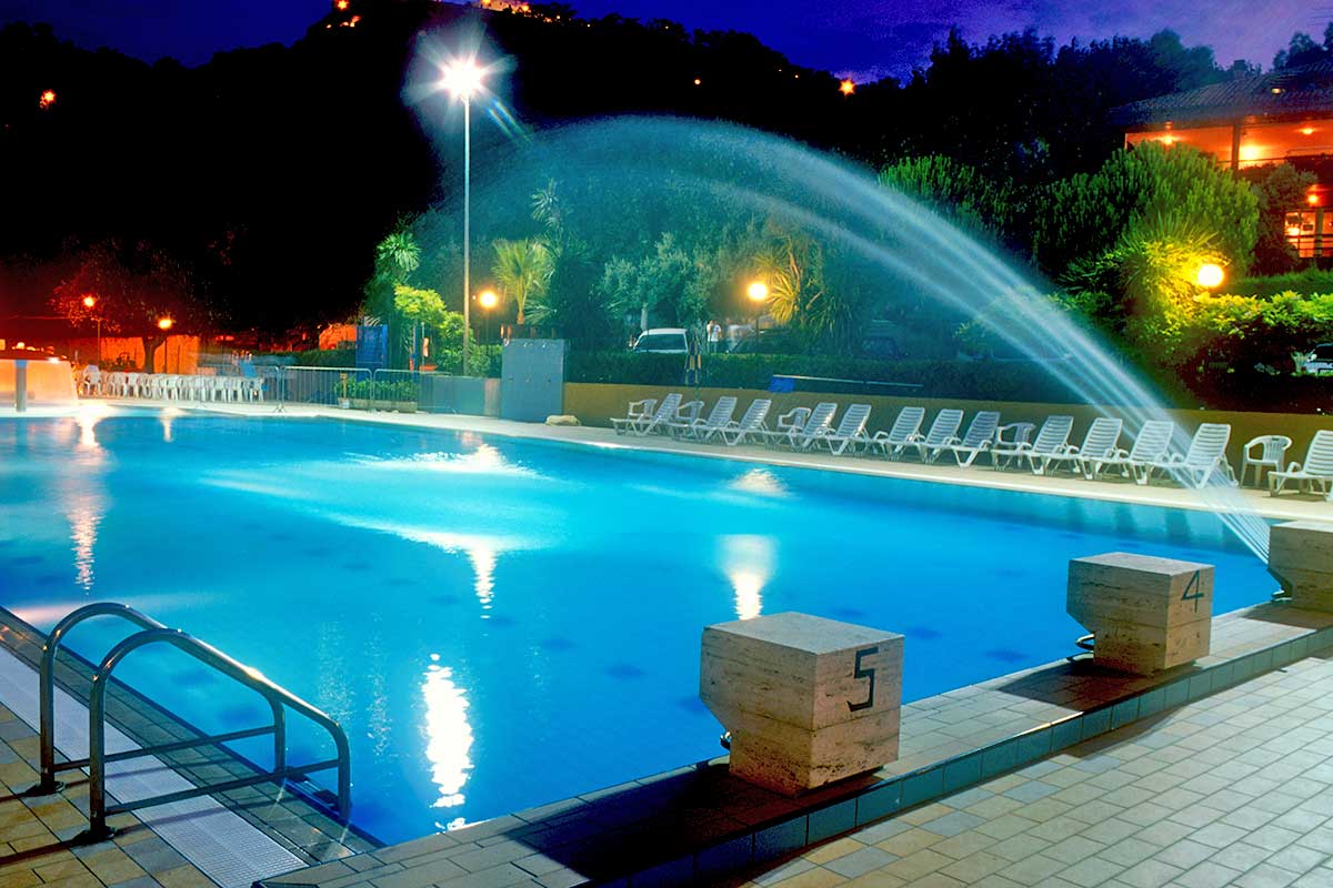 La zona piscine comprende un gran numero di attrezzature e vi si svolgono numerose attività per grandi e piccini. Il pomeriggio, dopo una mattinata in spiaggia, è piacevolissimo sdraiarsi sui lettini del solarium o sul materassino con gli occhi che si perdono all’orizzonte sul mare accarezzati dalla brezza marina. Il fungo e l’idromassaggio accontentano mamme e bambini. Nella grande piscina semiolimpionica (25 x 12,5 metri) di acqua dolce filtrata e il fondo di varie profondità si può fare veramente di tutto: praticare il nuoto più classico, lasciarsi cullare dall’acqua, giocare con gli amici, tuffarsi dai blocchi di partenza o dal trampolino per risalire poi dalle apposite scalette. Per i più piccoli le attività motorie e ricreative si svolgono sotto l’occhio attento di personale preparato dello Staff o dei genitori nell’apposita piscina appositamente studiata solo per loro.