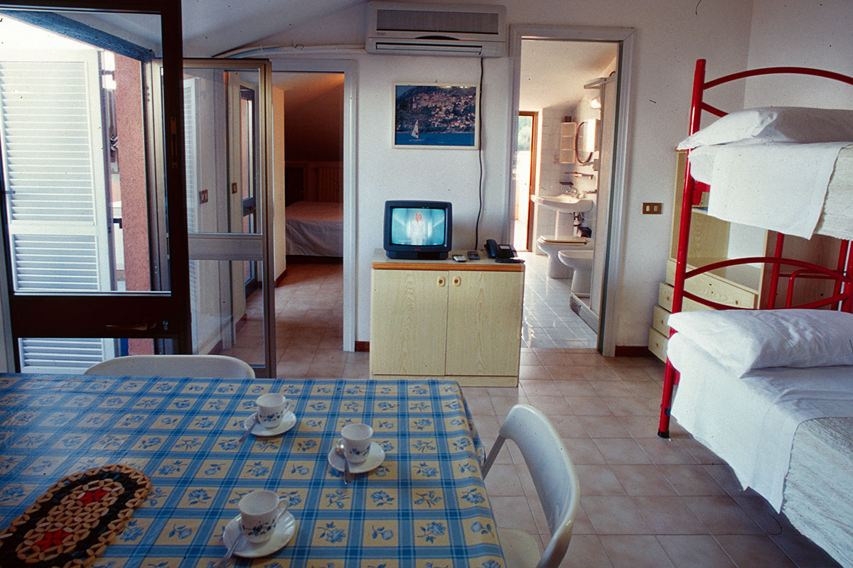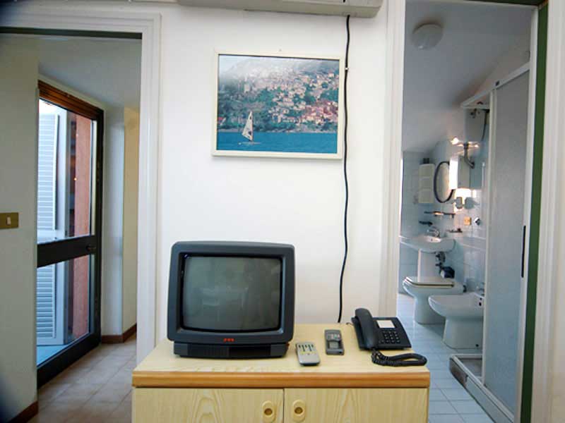frigo, stoviglie, ecc., bagno (WC, lavabo, doccia, water e bidé, asciugacapelli), cassetta di sicurezza, telefono, ampia terrazza arredata. |